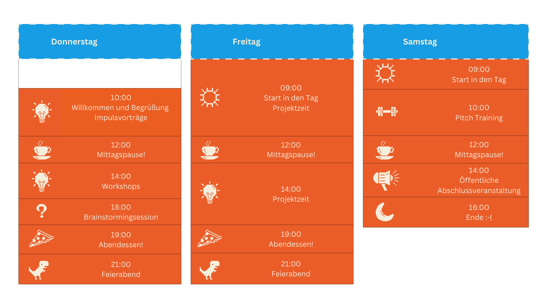 Unter fachlicher Anleitung, aber in ihrem Wirken völlig frei, entwickeln die Jugendlichen an drei Tagen in den Osterferien ihre eigenen Ideen und Lösungsansätze. Sie arbeiten in Teams, die von ihnen selber zu Beginn des Hackathons gebildet werden. Am letzten Veranstaltungstag (Samstag) stellen alle Teilnehmenden ihre Lösungsansätze in einem Pitch vor. Eingeladen zur Abschlussveranstaltung sind insbesondere Eltern, Freunde und Verwandte, aber auch alle interessierten Bürger*innen aus Münster und Umgebung.