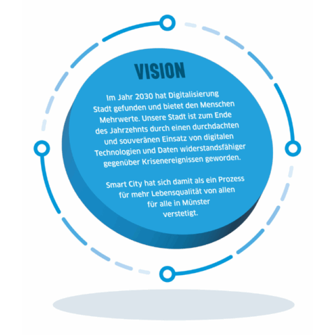 Mit einem durchdachten und souveränen Einsatz von digitalen Technologien und Daten wird unsere Stadt widerstandsfähiger gegenüber Krisenereignissen. Smart City wird sich damit als ein Prozess für mehr Lebensqualität von allen für alle in Münster verstetigen. Die Vision ist eine Vorstellung dessen, was Münster im Kern anstrebt und sie soll die Akteur*innen aus Stadt, Zivilgesellschaft, Wirtschaft und Wissenschaft anregen und motivieren gemeinsam mit uns die Smart City Münster zu gestalten.